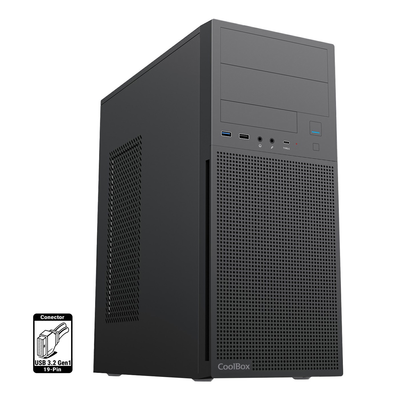 microATX / Cooler CPU 140 mm / 3×SSD + 1×HDD / USBC + USB 3.2 + USB 2.0 / Fuente de 500W